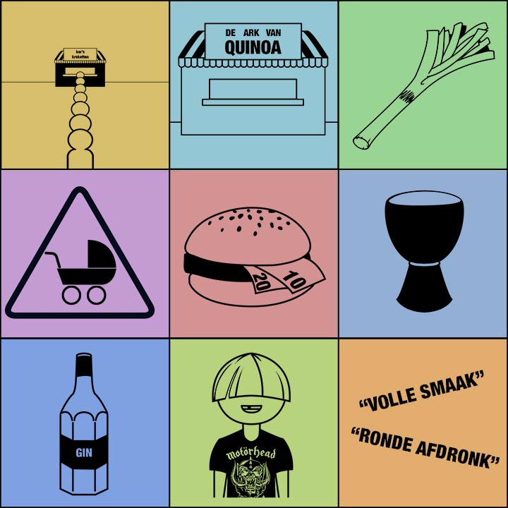 Och wat ludiek! Dit kraampje heet Sugarfree Hooper. En deze Ienemiene Mutte, Hier Geen Gluten. Woordgrappen die je probeert te vergeten zodra je ze op het krijtbord hebt zien staan. Maar dat lukt je niet. Ze blijven je bij. Het maakt niet uit hoe vaak je doucht, je gaat deze woordgrappen nooit meer vergeten. En uiteindelijk, als je op je sterfbed ligt en probeert te luisteren naar de troostende woorden van je kleinkinderen, zal het enige wat je nog zult horen een echo uit het verleden zijn: 'De Ark van Quinoa…' En dan ga je dood.