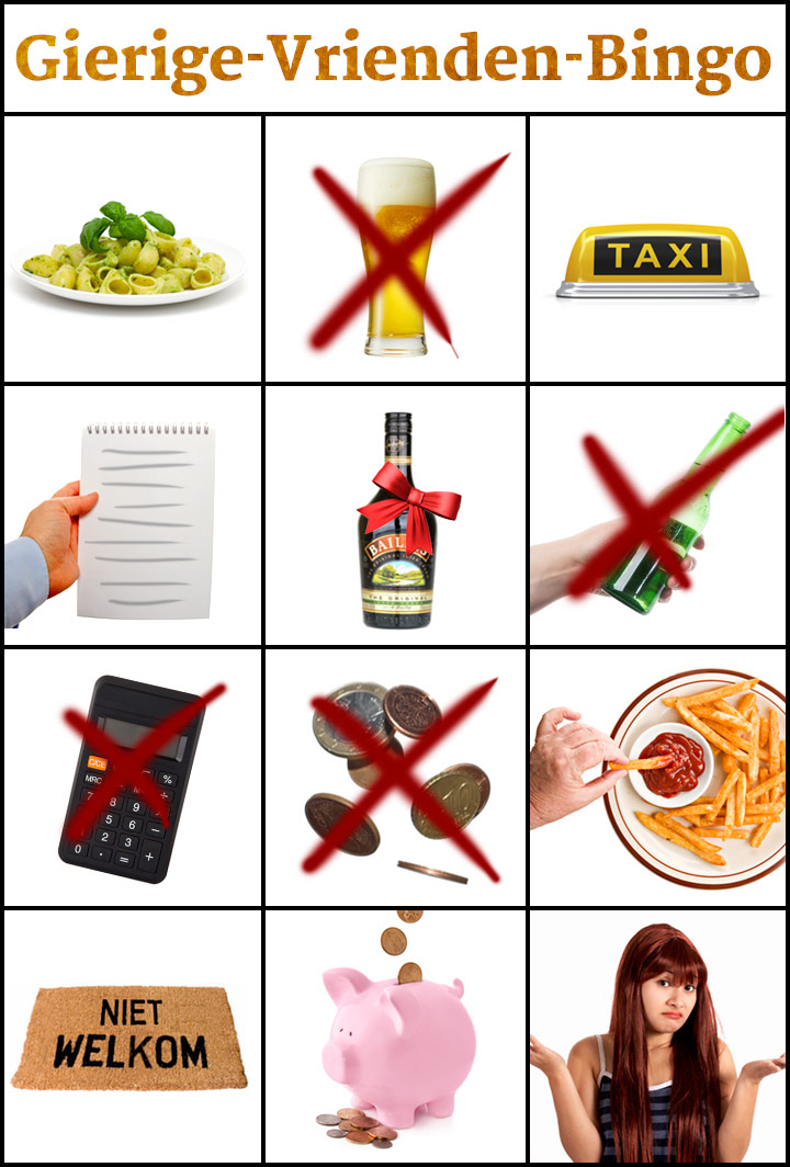 Hoe vaak ben jij eigenlijk al slachtoffer geworden van je gierige vrienden? Print de Gierige-Vrienden-Bingokaart, stop 'm in je portemonneetje en streep elke keer dat je in een gierige situatie met je gierige vriend(in) terecht bent gekomen een icoontje weg. Volle kaart? Dan mag je je vriendschap beëindigen! Onder de kaart vind je de situaties.