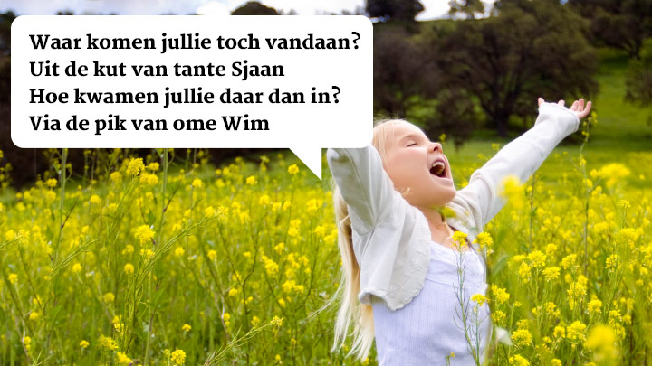 Iedereen die ooit een jeugd heeft gehad weet hoe bevrijdend het voelde toen je voor de eerste keer het woord ‘kutje’ durfde te zeggen. Dat kon allemaal maar gewoon. Tegenwoordig zou mama meteen met Bureau Jeugdzorg aan de lijn hangen, maar vroeger deden ouders gewoon alsof ze het niet hoorden. Mooi was die tijd. Ken je deze rijmpjes nog?