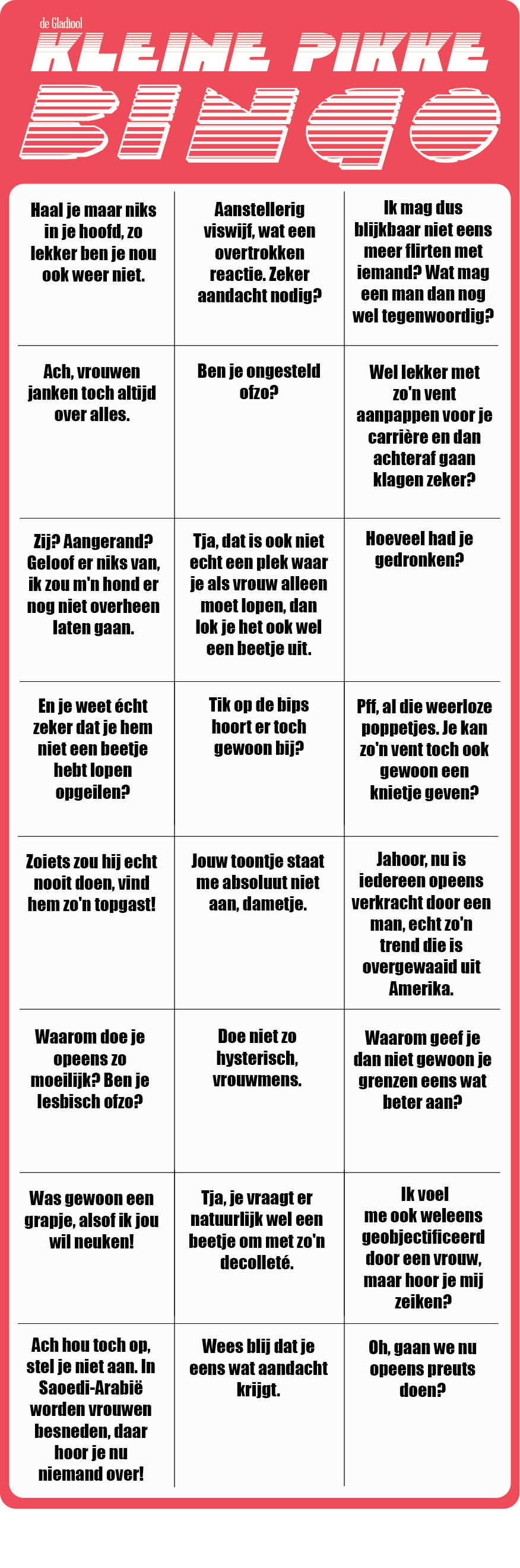 Neem dit bingovel een weekje mee naar al je gesprekken met mannen en kijk hoe ver je komt met afstrepen!