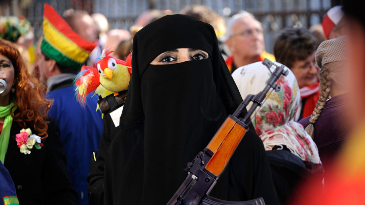 Hmmm... Dus op straat wel, maar in de tram, die over die straat rijdt niet? Thuis, waar zelfs de meest hardcore boerkadraagster 'm afdoet, wel? En wat zeg je? Met carnaval mogen de straten zwartkleuren met boerka's?