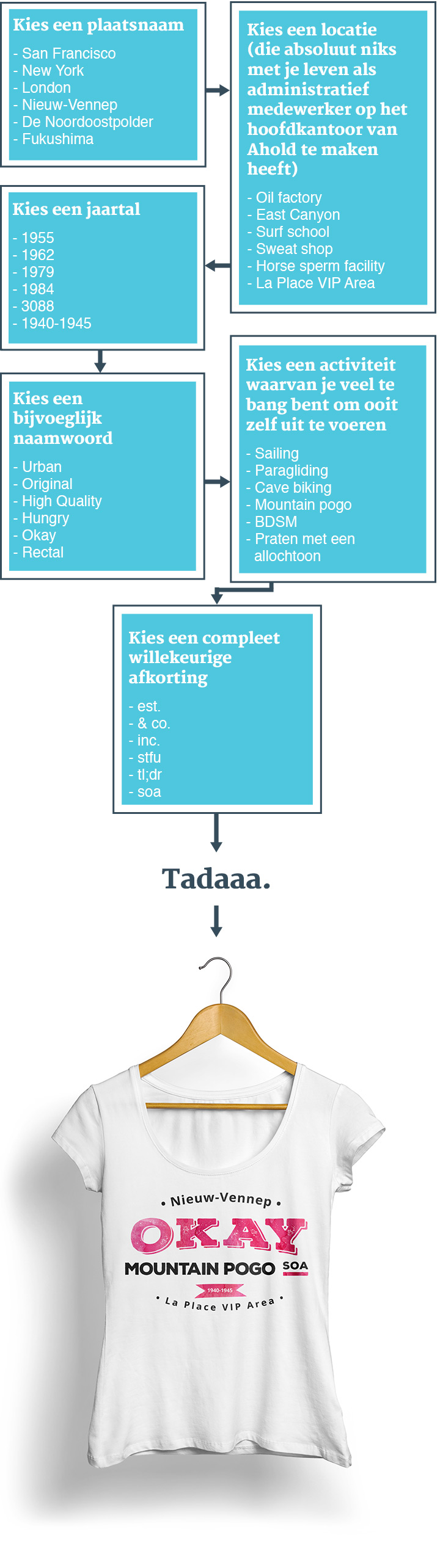 Hoe moeilijk dit fenomeen ook te begrijpen is: het is niet moeilijk om zelf zo'n tekst te bedenken. Gebruik onderstaand stroomdiagram om je eigen onbegrijpelijke kledingtekst samen te stellen. Veel succes!